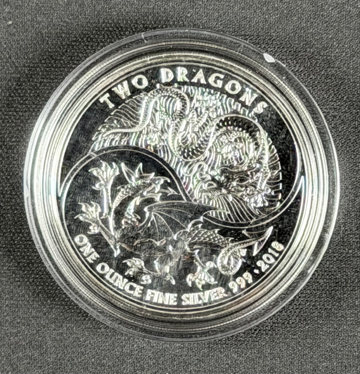 This 2018 Two Dragons silver coin from Great Britain features a striking high-detail design showcasing two intertwined dragons, a powerful symbol of strength, balance, and tradition. The intricate relief and mirrored fields give the coin exceptional visual depth, making it a standout piece among modern world silver issues.