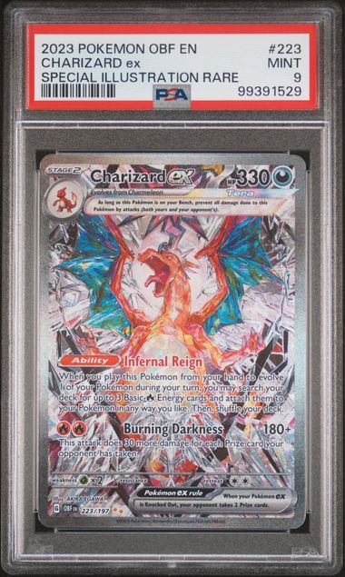 This 2023 Pokémon Obsidian Flames (OBF) - Charizard #223 - Special Illustration Rare - PSA 9 is a highly coveted collector's item. With a PSA 9 grading, this card is in excellent condition and features a rare special illustration of Charizard. Add it to your collection and watch its value soar.