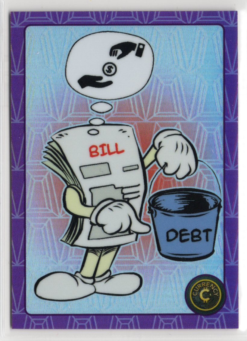 The artwork presents a stylized take on financial liability and debt, paired with the Series 5 geometric foil pattern that adds depth and texture under light. With a /299 print run, Tanzanite sits as an accessible yet collectible gemstone tier for Series 5 builders and concept-focused collectors.