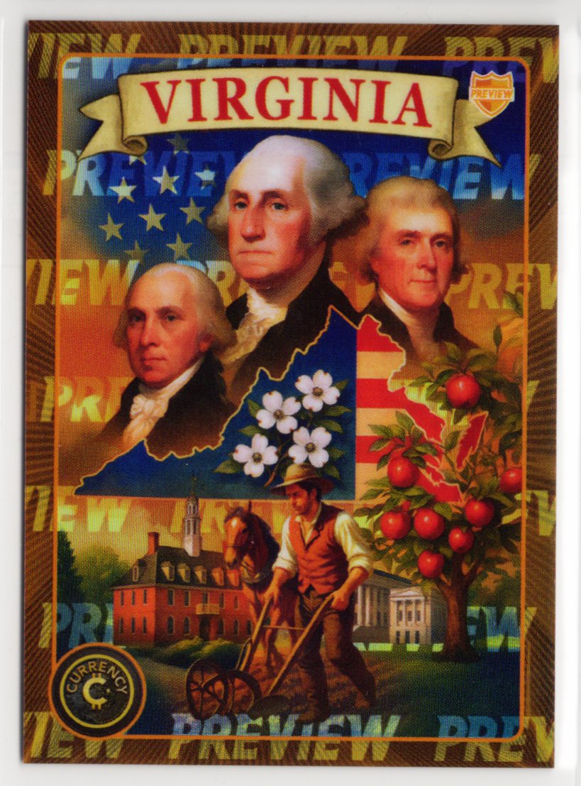 This Virginia preview card comes from Cardsmiths Currency Trading Cards Series Six and showcases an early look at one of the state-themed designs ahead of the full release. The artwork highlights Virginia’s historical figures, agricultural roots, and early American heritage, layered with Cardsmiths’ signature crypto-inspired design language. Preview cards are produced in limited quantities and distributed ahead of the main checklist, making them desirable early-release pieces for collectors building out Series Six sets.
