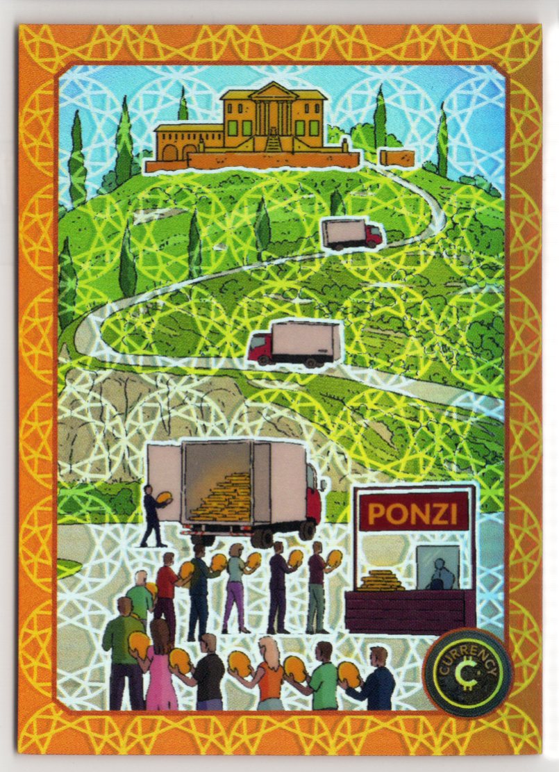 The Beryl variant of Ponzi Scheme from Cardsmiths Series 3 highlights one of the most infamous financial deceptions in history. Numbered 111/149, this collectible captures the allure and danger of too-good-to-be-true investments — a cautionary tale immortalized in glossy Beryl brilliance.