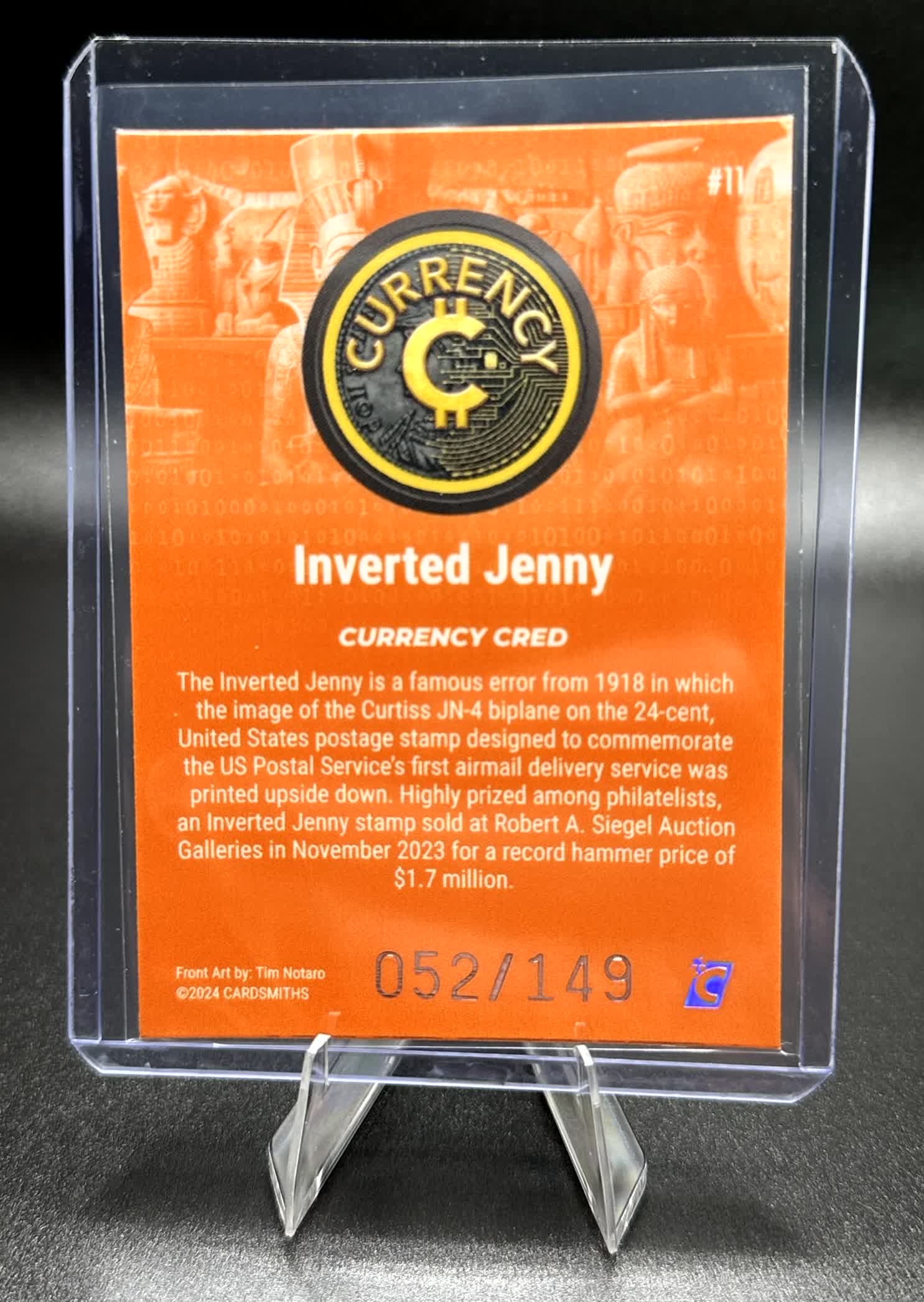 The Inverted Jenny is a famous error from 1918 in which the image of the Curtiss JN-4 biplane on the 24-cent, United States postage stamp designed to commemorate the US Postal Service’s first airmail delivery service was printed upside down. Highly prized among philatelists, an Inverted Jenny stamp sold at Robert A. Siegel Auction Galleries in November 2023 for a record hammer price of $1.7 million.