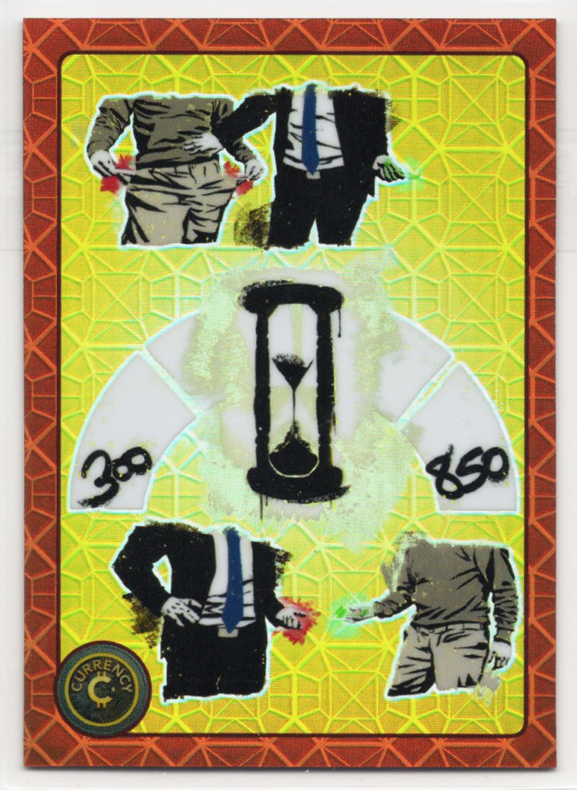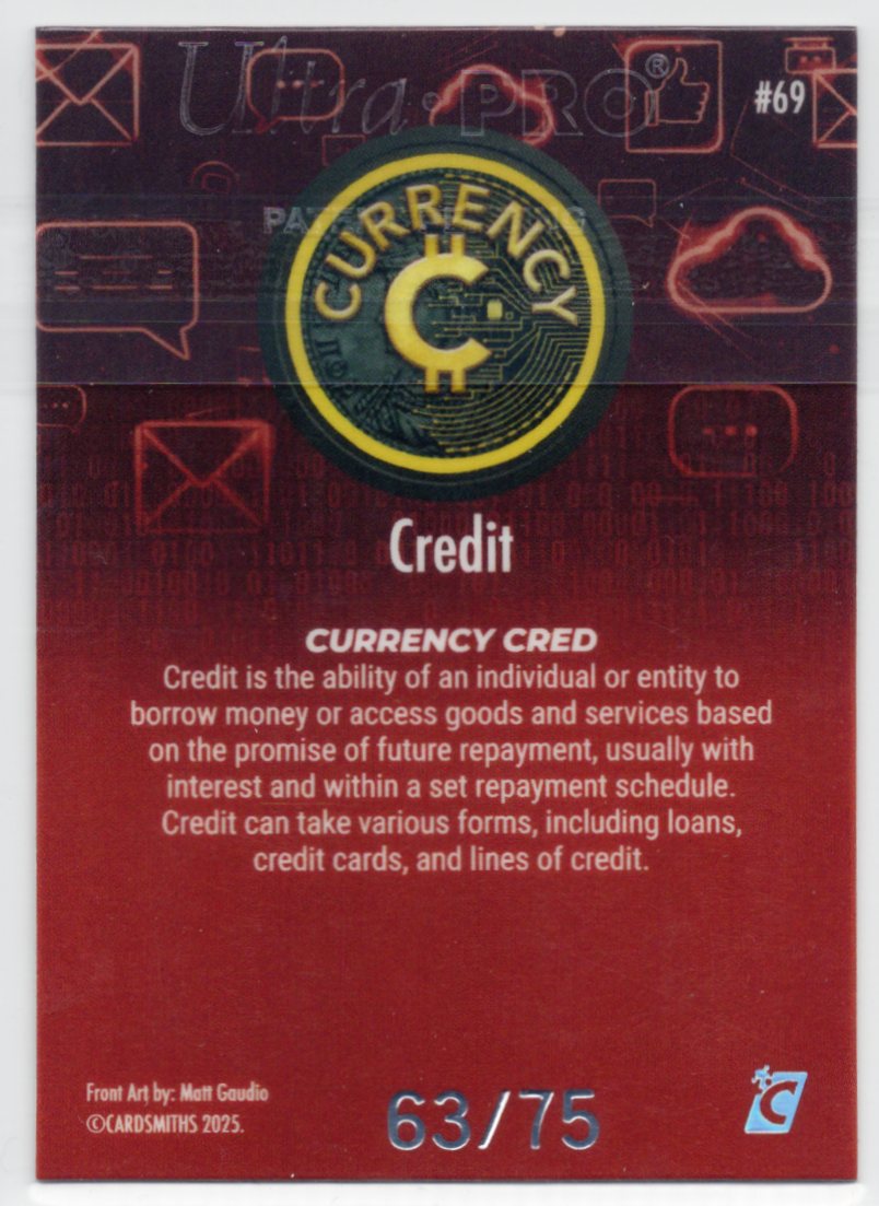 This Cardsmiths Series 5 Credit #69 – Garnet 63/75 features striking artwork themed around credit scores, borrowing, and repayment, illustrated in a bold stencil-style design. The Garnet parallel out of 75 adds a deep red holographic pattern with strong shine and excellent eye appeal.