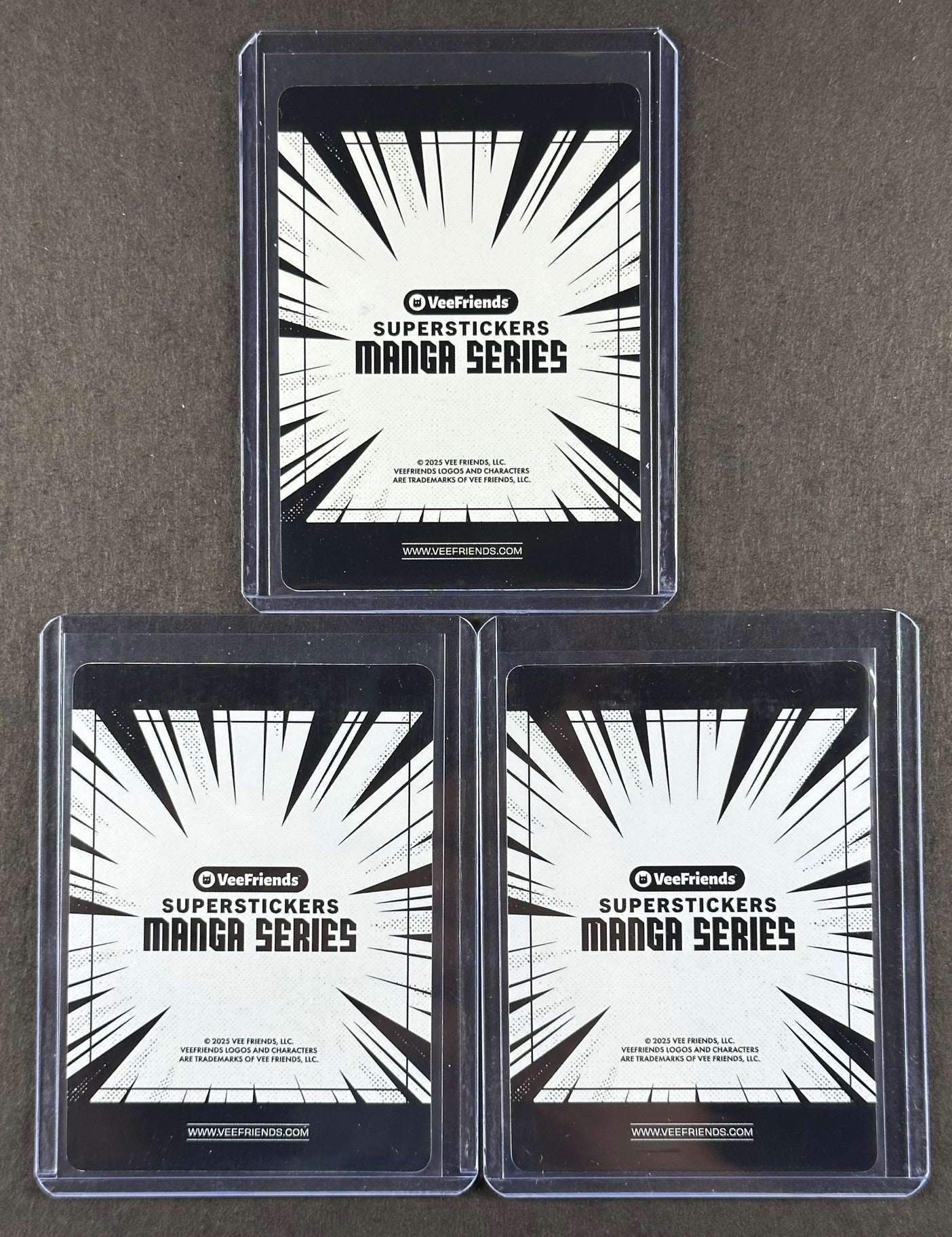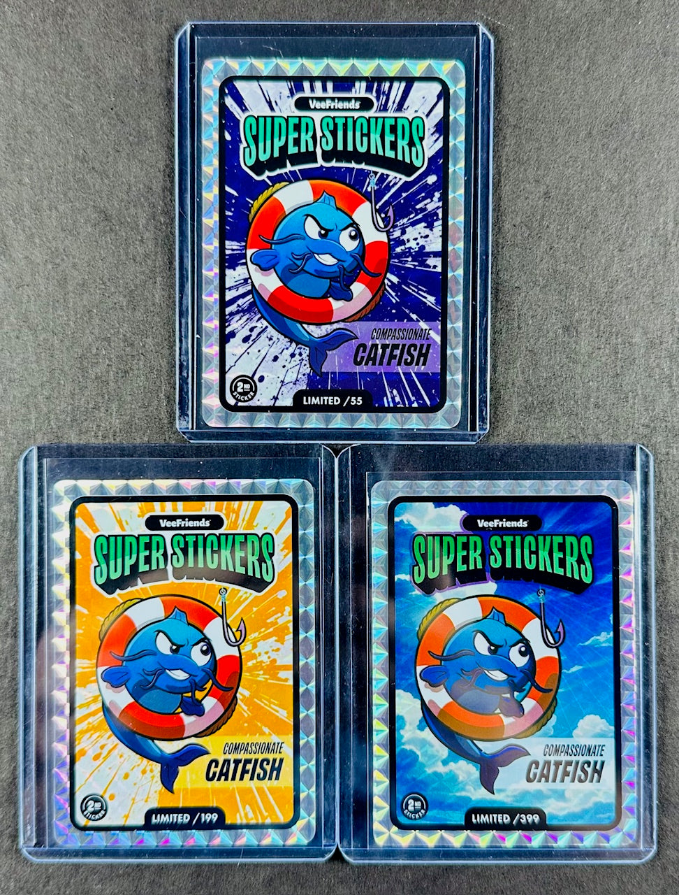 VeeFriends Super Stickers – Compassionate Catfish 3-Card Bundle – Purple Splash /55 + Orange Splash /199 + Manga Clouds /399