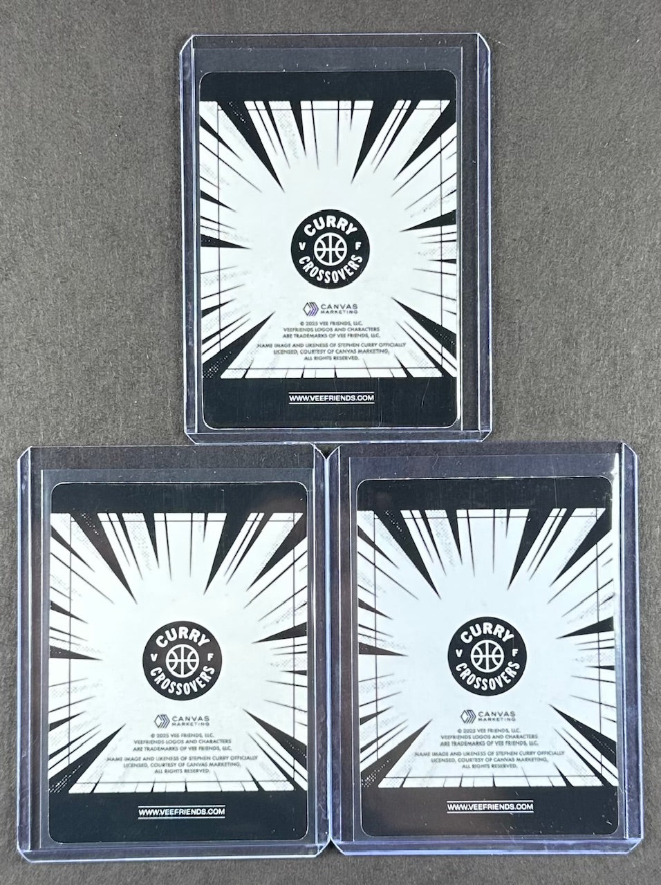 This three-card Curry Crossovers bundle features Stephen Curry matched with three fan-favorite VeeFriends characters in full holo foil. Each card showcases Curry interacting with the character in a fun storyline moment, blending NBA action with VeeFriends creativity. All cards were pack-pulled, sleeved immediately, and stored in top-loaders for protection.