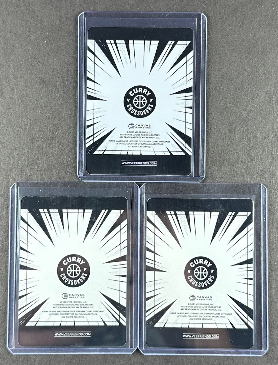 This three-card Curry Crossovers bundle showcases Stephen Curry paired with iconic VeeFriends characters in vibrant refractor artwork. Each card features Curry interacting with a different character mid-play, creating a fun mash-up between NBA action and VeeFriends personality design. All three cards were pack-pulled, immediately sleeved, and stored in top-loaders for protection.