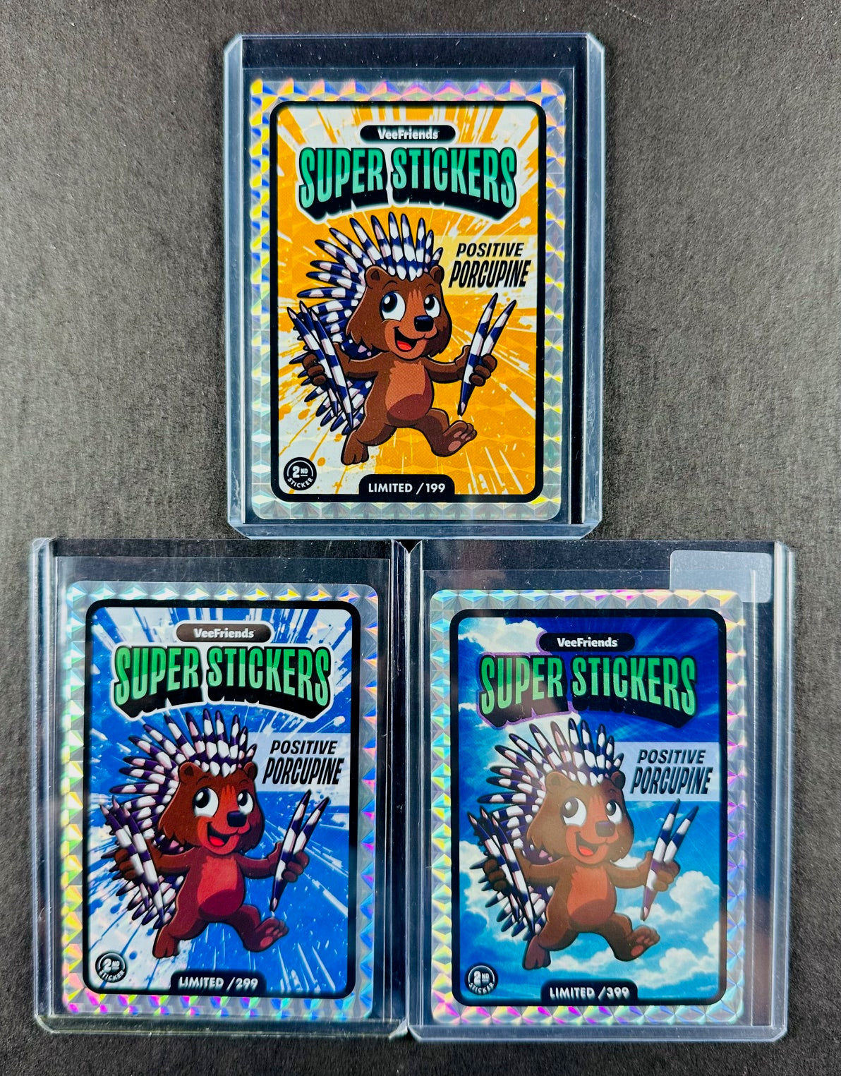 VeeFriends Super Stickers – Positive Porcupine 3-Card Bundle – Orange Splash /199 + Manga Splash /299 + Manga Clouds /399